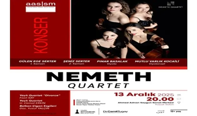 Nemeth Quartet konseri, 13 Aralık’ta Küçük Salon’da saat 20.00’de düzenlenecek. 1995 yılında kurulan ve isimlerini aynı yıl trafik kazasında hayatlarını kaybeden hocaları Istvan Nemeth (keman) ve Katalin Nemeth’ten (çello) alan grup; Gülen Ege Serter (keman), Şenis Serter (keman), Pınar Basalak (viyola) ve Mutlu V. Kocaili’den (çello) oluşuyor. Konserin bilet satışı kultursanatbilet.izmir.bel.tr adresi üzerinden yapılıyor.