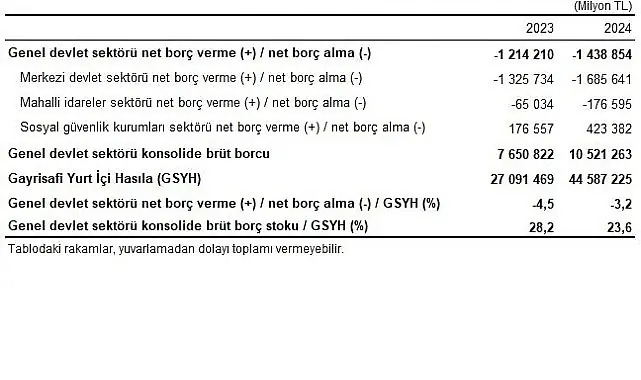 Genel devlet açığı 2024 yılında 1 trilyon 438 milyar 854 milyon TL olarak tahmin edildi ve bir önceki yıl %4,5 olan genel devlet açığının Gayrisafi Yurt İçi Hasıla’ya (GSYH) oranı %3,2’ye düştü. Merkezi devlet ve mahalli idareler alt sektörleri 2024 yılında açık verirken sosyal güvenlik kurumları alt sektörü fazla verdi. Genel devlet konsolide brüt borç stokunun GSYH’ye oranı ise 2024 yılında %23,6’ya düştü.
