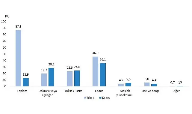 Kadınlarda ise en yüksek pay lisans mezunlarında (%36,1) olup, bunu doktora veya eşdeğeri (%28,5) ve yüksek lisans (%24,6) takip etmektedir.