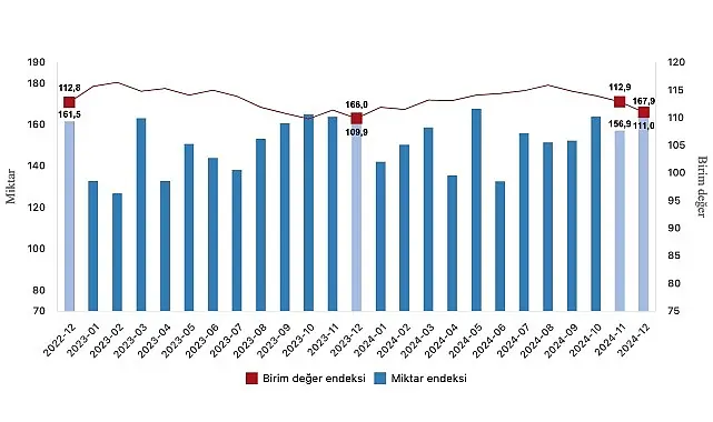 Mevsim ve takvim etkilerinden arındırılmış seriye göre ihracat miktar endeksi; 2024 Kasım ayında 151,4 iken 2024 Aralık ayında %3,1 oranında artarak 156,2 oldu. Takvim etkilerinden arındırılmış seriye göre ise ihracat miktar endeksi; 2023 yılı Aralık ayında 170,3 iken 2024 yılı Aralık ayında %2,8 oranında azalarak 165,5 oldu.